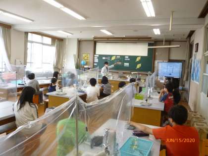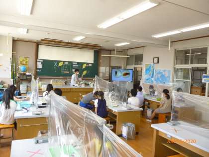 理科室での学習も始まりました。4人が向い合せで座っていたテーブルも様変わりしました。安全に実験や観察をしていきたいです。