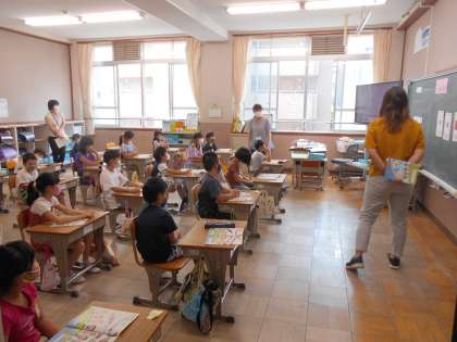 外国語活動ではALTのマキ先生と一緒にいろいろな国を英語で言ったり,いろいろな国の挨拶の言い方を聞いたりしました。国によって挨拶の言い方が違うことに驚いていました。