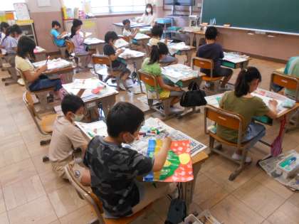 図工では思い出の絵に絵の具で色をぬりました。細かいところは筆先を使ってぬったり,色の濃さを変えたりして一人一人工夫しながら取り組みました。完成が楽しみです。