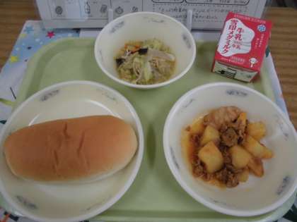今日の給食は,「ミルクコッペパン・牛乳・豚肉のケチャップ煮・たっぷり野菜のビーフン」でした。