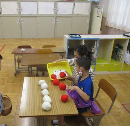 お店屋さんとお客さんになって,数の勉強をしました。お店屋さんになった時は,赤玉と白玉を机の上にならべる顔も真剣。数字カードの裏にはってあるシールを数えながら,玉の数を確かめてお客さんに渡していました。