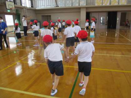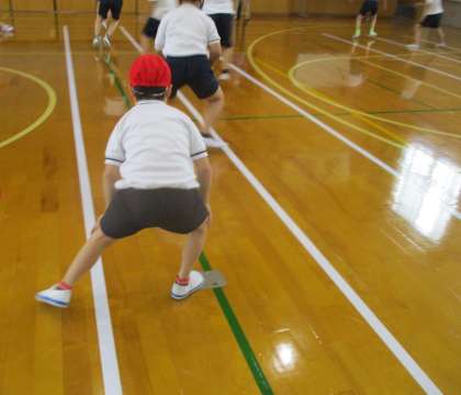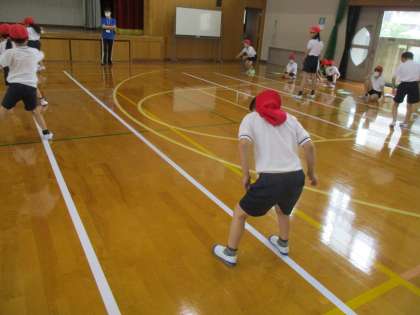 先生の説明をしっかりきいて,みんなといっしょに反復横とびをしました。横にとぶのは苦手かとおもいきや,練習1回した後は,上手にとんでいました。