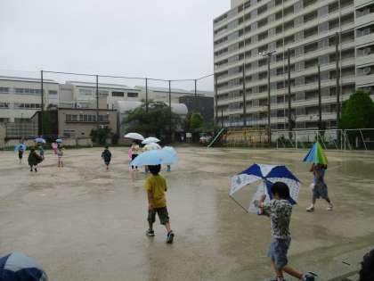 と言いながら,大喜びで雨の運動場をたんけんしました。
