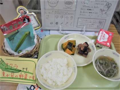 今日の給食は,「ごはん・牛乳・なま節のしょうが煮・かぼちゃの煮つけ・七夕そうめん」でした。今日は七夕にちなんだ行事献立でした。あいにくの雨模様ですが,給食の七夕そうめんには,天の川に見立てたそうめんや星に見立てたオクラが入っていました。旬をむかえたかぼちゃは,スチームコンベクションオーブンを使って調理をすることで,ほくほくとした食感で野菜の甘みを十分に味わえる献立でした。おかずやごはんのおかわりにも,たくさんの手があがっていました。