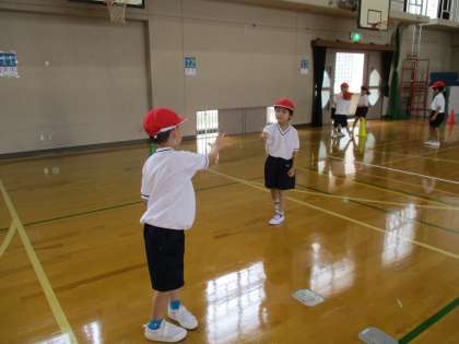 ゴムを使って,ゴム跳びをしたり,じゃんけんをして,できるだけ遠くに行けるように跳んだりしました。