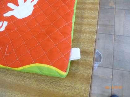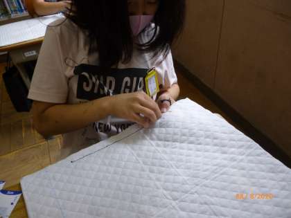 袋の「わき」の部分をぬっています。「本返し縫い」も上手になってきました。