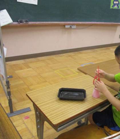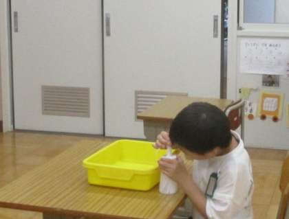 生活雑貨を使って,指先のトレーニング。まずは,ソースの容器に細めのストローを入れます。全部いれたら,ふたをパチンとしめ,シャカシャカ振って音を楽しんだ後は,おみくじのように一本づつ取り出します。楽しく遊びながら,指先のトレーニングができます。