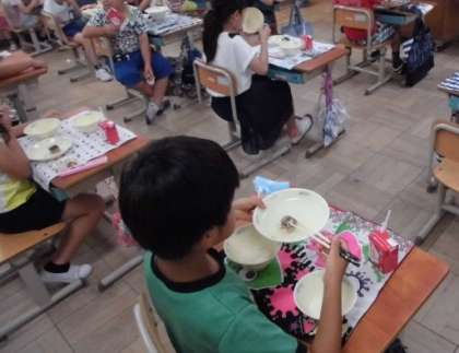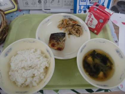 今日の給食は,「ごはん・牛乳・さばのつけ焼き・切干大根の三杯酢・みょうがのみそ汁」でした。「さばのつけ焼き」は,スチコン(スチームコンベクションオーブン)を使って照りよく焼き上げた焼き魚で,ごはんが進む献立でした。また,みそ汁には,高知県のみょうがが入り,食感や香りを楽しみながら味わうことができました。