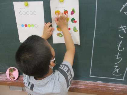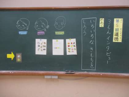 道徳の学習で『3問インタビュー』をしました。先生の好きなものを予想してから,インタビューをしました。『自分はバナナが好きだけど,先生はスイカが好き』『自分は赤が好きだけど先生は青が好き』など,自分の好きなものが必ずしも人と同じではないことに気づくことができました。