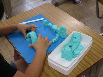 「ねんどマイタウン」みんなねんどの形を工夫しながら町を作りました。タワーができている町や未来の町を想像しながら活動していました。