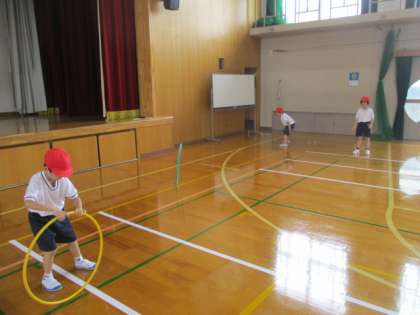 フラフープを使って,投げたり受けたりして楽しみました。