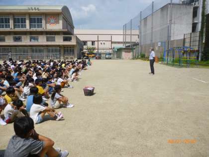 先週延期になった避難訓練がありました。6年生は3階の東端からの避難経路を確認しました。運動場に全校が集合したときは,とても暑かったです。火災が起きないように気を付けていきたいですね。