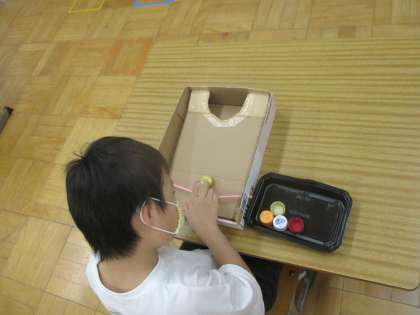ゴムを軽くはじいて,穴にキャップを入れます。力加減が難しいです。「もういっかい。」と言いながら何度もやっていました。
