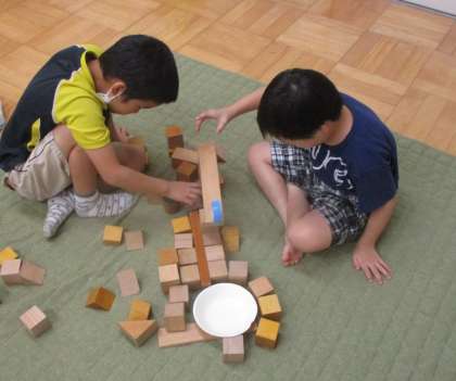 いろいろな形の積み木を使って遊びました。高く積み上げたり,転がしたり・・。もっと転がるものはないかと教室を探し,ビニールテープを発見。何度も転がし,ついにお皿の中にコロコロポトン,大成功!!!