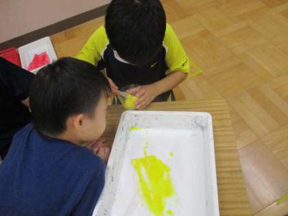 スポイトや霧吹きを使って,かき氷を作りました。初めてのスポイトですが,指先を上手に使って絵具を吸ったり,ポトポトと落としたりできました。自分の順番がくるのを,静かに待つこともできました。