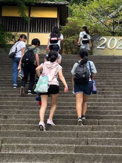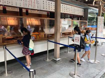 みんな頑張って785段の階段を上り切りました。上でアクエリアスを飲んだら、あとは楽しみにしていたおみやげのお買い物タイム。そこでしか買えない金の幸せの御守りをさっそく買う人がいました。今から下に下りて、お買い物の続きです。