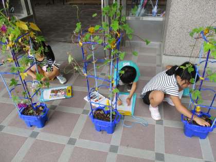 今日は生活科の学習で,1組はあさがおの実の観察,2組はいきもの見つけをしました。