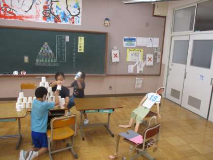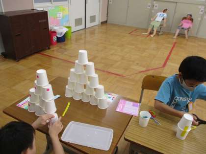 勝敗がおこらないゲームで,みんなで協力し記録更新をめざします。紙コップをみんなで高く積んで,紙コップのお城を完成させました。1回目より2回目,2回目より3回目というように,目標を高くしながらがんばりました。友だちの順番の時には,「がんばれ」と手作り楽器をならして応援しました。