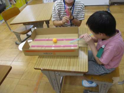 スキルタイムに ストローを使って『口のトレーニング』。「ふっ」と吹いてみたり,「ふう〜」と長めに吹いてみたり,声かけにあわせて吹き方を変えてやりました。ピンポン玉がお皿に入った時の笑顔は最高でした。