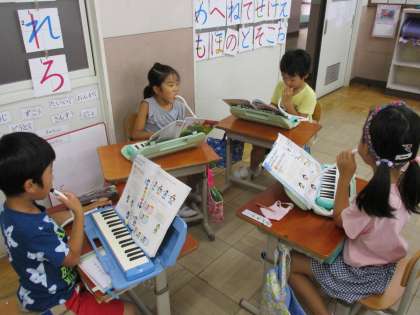 3つの音でお話した後は,リーダーさんの吹く音のまねっこをしました。