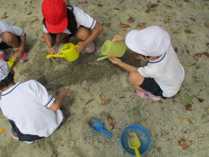 砂遊びの活動で大きな川を作り,ダイナミックに遊んでいました。