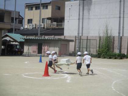 体育で運動会の団体競技『祭りだ!!ワッショイ!!』の練習をしました。お神輿にのせた箱が落ちないように,力を合わせて走ります。本番が楽しみです。