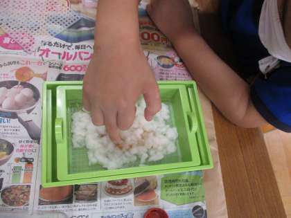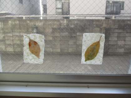 秋見つけで,色づいた葉っぱを拾い,パルプ液の上にのせてはがきをつくりました。水にパルプの紙片を溶かすのが大変でした。音楽に合わせてペットボトルを振ったり,途中からリレー形式にかえて順番に振ることにしたり・・・15分くらいシャカシャカしました。