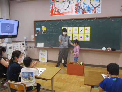4人で「キャベツ」「トウモロコシ」「ナス」「トマト」「タマネギ」など8つの野菜を使ってビンゴゲームをしました。「コ〜ン」「トマ〜ト」と発音もバッチリ。友だちに発表の順番を譲ってあげる姿もみられました。元気いっぱい,そして優しい気持ちもいっぱいの時間になりました。