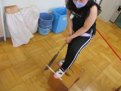 今日は初めてのこぎりを使いました。少し緊張した様子でしたが,けがをしないように,正しい使い方で木を切ることができました。とても満足した表情で,次からの作品づくりも楽しみにしていました。