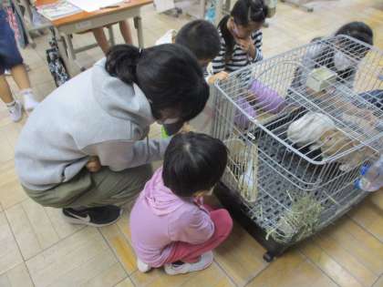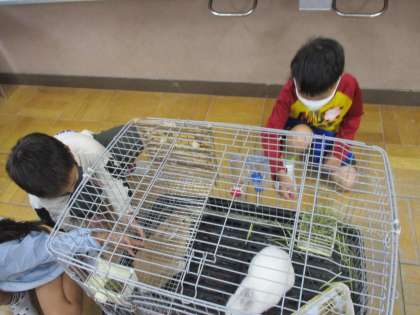「いきものとなかよし」の学習で今日はうさぎのココちゃん・ゆきちゃんの観察をしました。