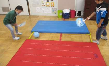 今日は雨が降っていて,運動場に出られなかったので,教室でうちわサッカーをして遊びました。パタパタとうちわを動かして,風船をゴールにいれました。ピンポン玉でもやってみました。風船のほうが難しいようでした。