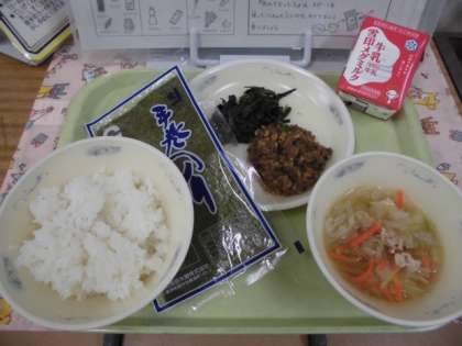 今日の給食は,「ごはん・牛乳・肉みそ納豆・手巻のり・ほうれん草のおかか煮・キャベツの吉野汁」でした。