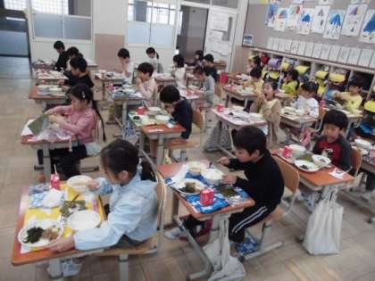 肉みそ納豆は,納豆が苦手な児童も,この献立で食べられるようになったという話を聞くほど,納豆を食べやすく調理した献立です。1年生の教室では,納豆を初めて食べるという児童もいましたが,「これなら,食べられる!」と手巻のりでごはんと具を巻いてパクっとおいしそうに食べていました。納豆とのよい出会いができていました。
