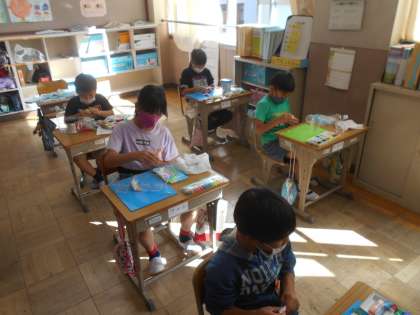 図工では「空きようきのへんしん」の学習を行っています。