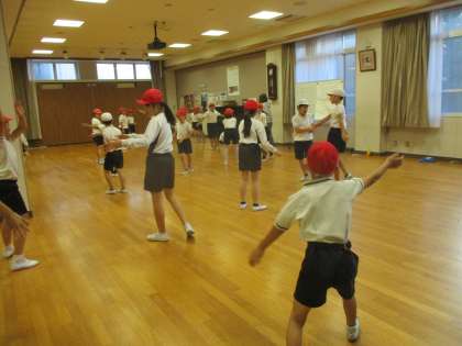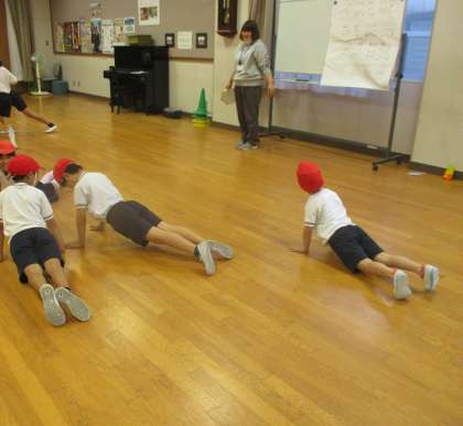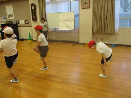 「だるまさんがころんだ はい ポーズ。」の声に合わせて,ぴたっと動きをとめました。友だちの動きを参考にしながら,ポーズをきめていました。後半は,ヴィバルデイの『四季』を聞きながら,からだを動かし,音楽を表現しました。