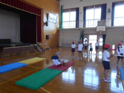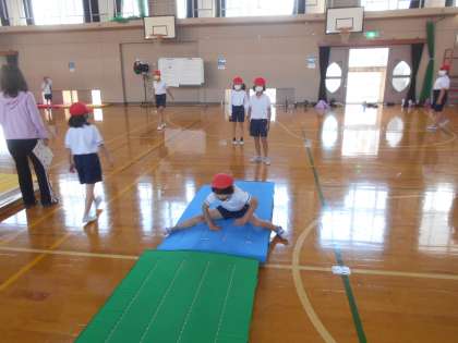 長いすの場では開脚前転それぞれできるように友だち同士でアドバイスをしながら活動しています。