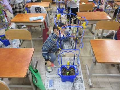支柱からつるを取るのに苦労していた子どもたちですが,