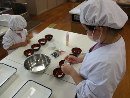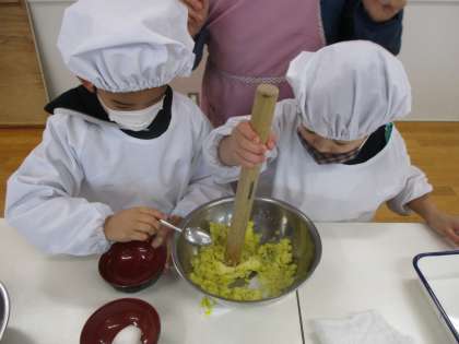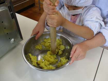フォークをさして柔らかくなったかを確認し,ほくほくに茹で上がったお芋に味付けをしました。トントン・グルグルと潰して混ぜて,良い香りのお芋ペーストができあがりました。