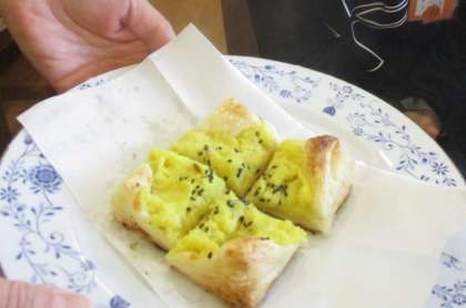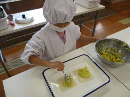 パイ生地にお芋ペーストをのせていきます。「美味しくなあれ!」と願いながらたっぷりのせました。