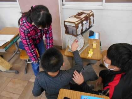 教室にあるいろいろなものを班で話し合ってランドセルや絵具セットを量っていました。