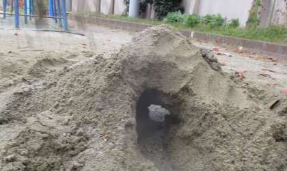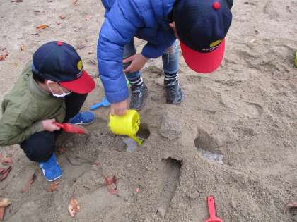 「よせて。」「いいよ。」のやりとりができるようになりました。二人でなかよく砂遊びしています。山,トンネル,川と作りたいものも増えてきました。