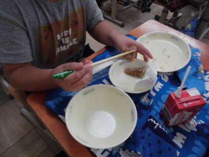 「ういろう」は,スチームコンベクションオーブンを活用した手作りの和菓子(デザート)です。米粉を水で溶いてたところに,水に溶かした黒砂糖を加え,全校分約300個の紙カップに急須を使って,流し込みました。スチームコンベクションオーブンで約50分蒸しあげて仕上げた「ういろう」は,黒砂糖の甘い香りともちもちとした食感で,児童も教職員もお楽しみのデザートでした。