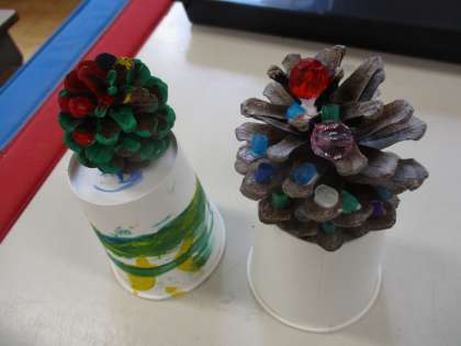 松ぼっくりで,飾りを作り始めました。「階段みたいにしたい」と言いながら,らせん状にビーズをつけたり,絵具を塗ったりしていました。自分だけの素敵な飾りができそうです。