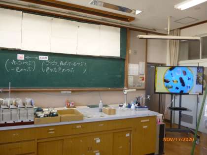 火山灰の粉を顕微鏡で観察しました。小さな粒ですが,キラキラ輝いているものや,黒い粒など,様々なものが混ざっています。