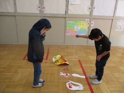 姿勢を正し,穂先を整えました。ゆっくり筆を運びはじめ,はらいに気をつけて「つり」と書きました。習字道具をかたづけた後に,つりゲームをしました。