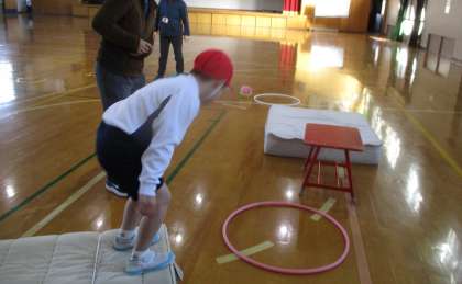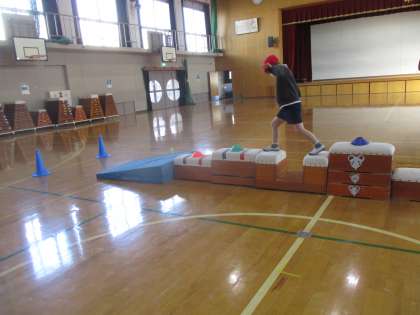 ひかり学級の体育でサーキット遊びをしました。低い跳び箱をつなげてミニコーンをおいたり,ケンステップの間隔を少し遠くしたり・・前回とメニューを少しかえてやりました。