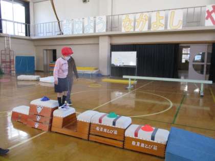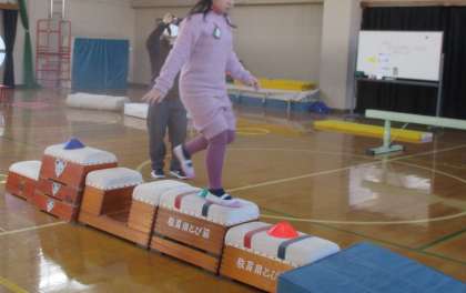 4人ともサーキット遊びを楽しみにしていて,やる気満々です。「ちょっと遠いな。とんでみよう。」「コーンをふまないようにしよう。」など状況判断をしながら,上手に体を動かしていました。