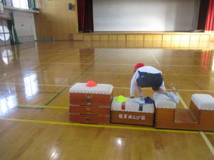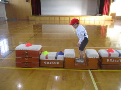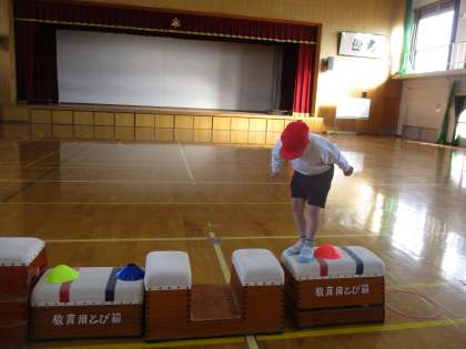障害物をよけて歩いたり,大ジャンプしたり,マットで前回りしたり・・・楽しく運動することができました。回を重ね,自分だけで最初から最後までできるようになりました。