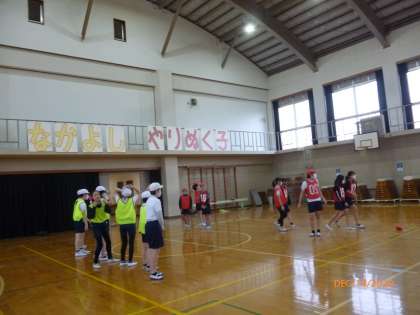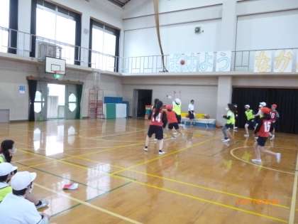 ドリブルやパスをつないで,ゴールを目指します。なかなか思うようにシュートが決まりませんが,楽しくできました。