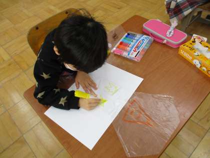 お正月遊びを楽しもうと,オリジナル凧を作りました。どんな絵柄にしようか考えながら色をたくさん使ってカラフルに仕上げていました。高くあがるといいですね!